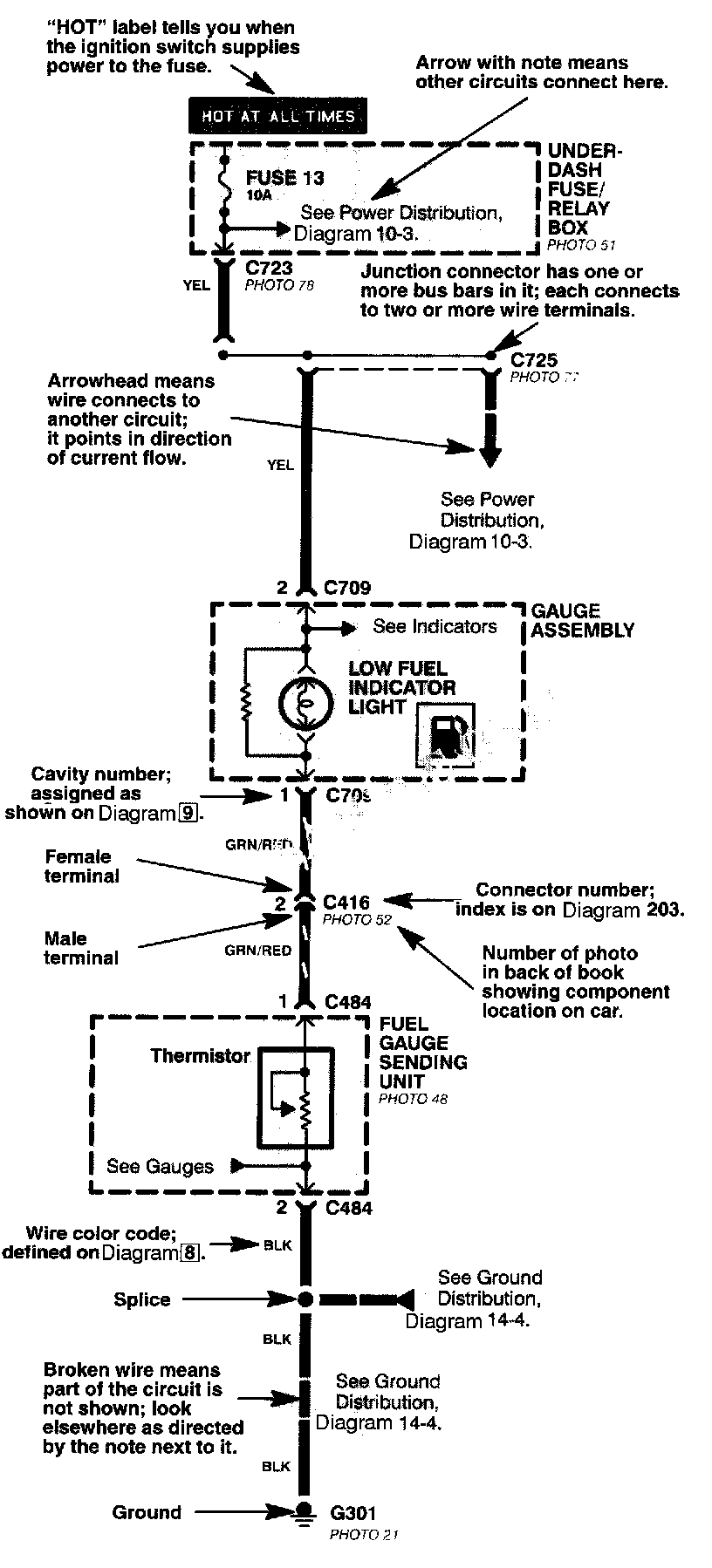 All connectors are numbered (C709, C416, etc.). Below each connector number (except those for components) is the number of a photo in the back of the book showing the connector's location on the car. Connector cavities are also numbered. The numbering sequence begins at the top left corner of the connector.