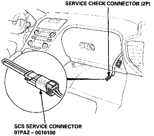 1. Pull out the service check connector located under the middle of the dash. Connect the BLU and BRN/BLK terminals with the SCS service connector.