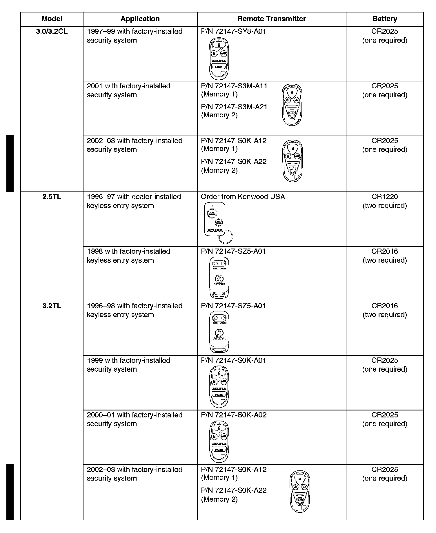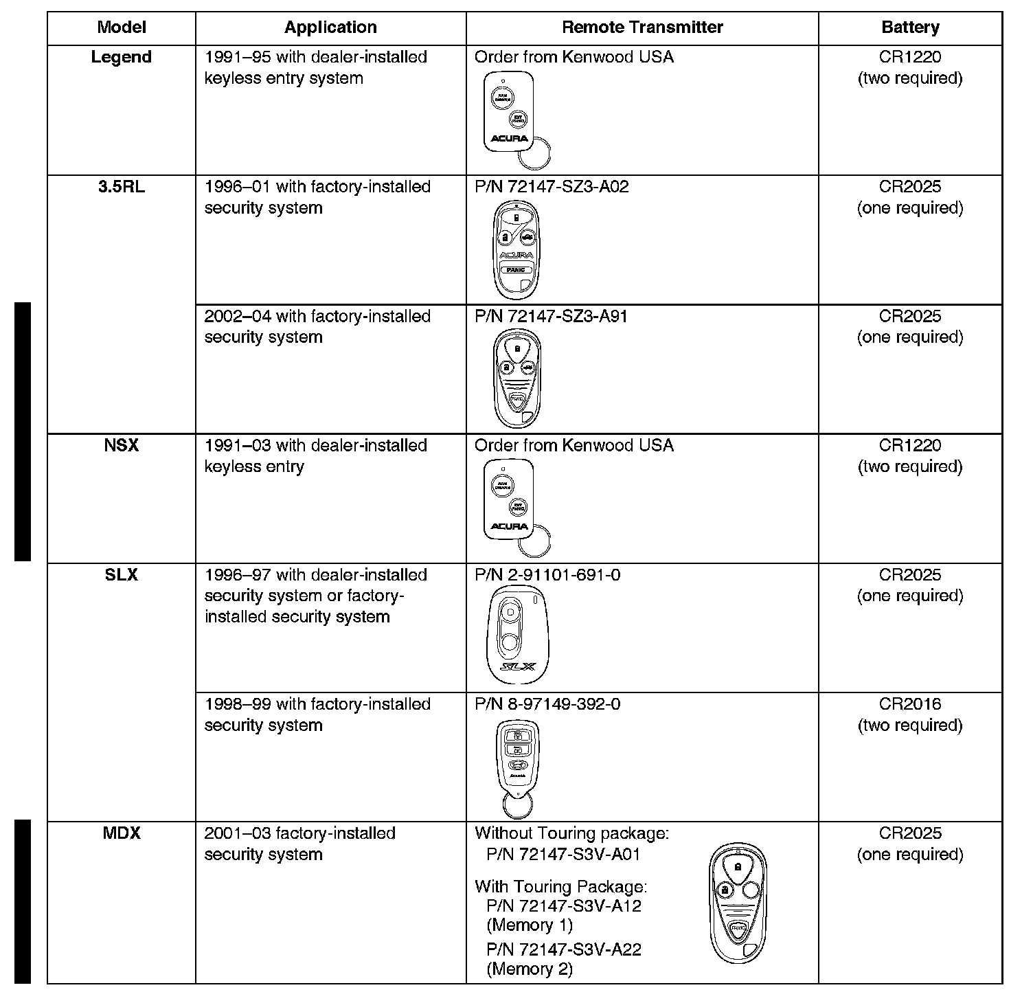 This service bulletin gives you information about keyless remote transmitters for most Acura vehicles. Each procedure describes transmitter programming (if applicable), transmitter ordering, and transmitter batteries. A transmitter quick reference guide shown.