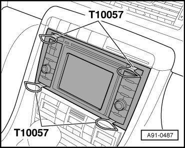 - Place Radio Release Tool (T10057) in release slits on Operating Electronics, Navigation Control Module (J402) until they engage. Points on grip eyes face outward.