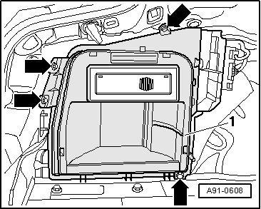 - Remove bolts - arrows - (14 Nm) and remove base mount - 1 -.