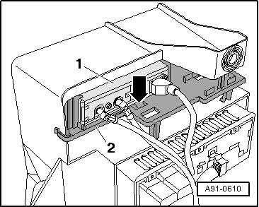 - Release Navigation Interface (R94) - 1 - at catch - arrow - and remove from mounting plate - 2 -.