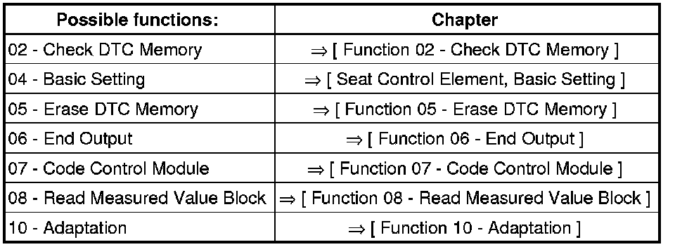If any control elements are replaced they must be adapted and a basic setting must be initiated => [ Seat Control Element, Basic Setting ].