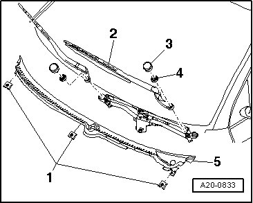 - Disconnect the retaining clips - 1 - and remove the cowl panel grille - 5 -.