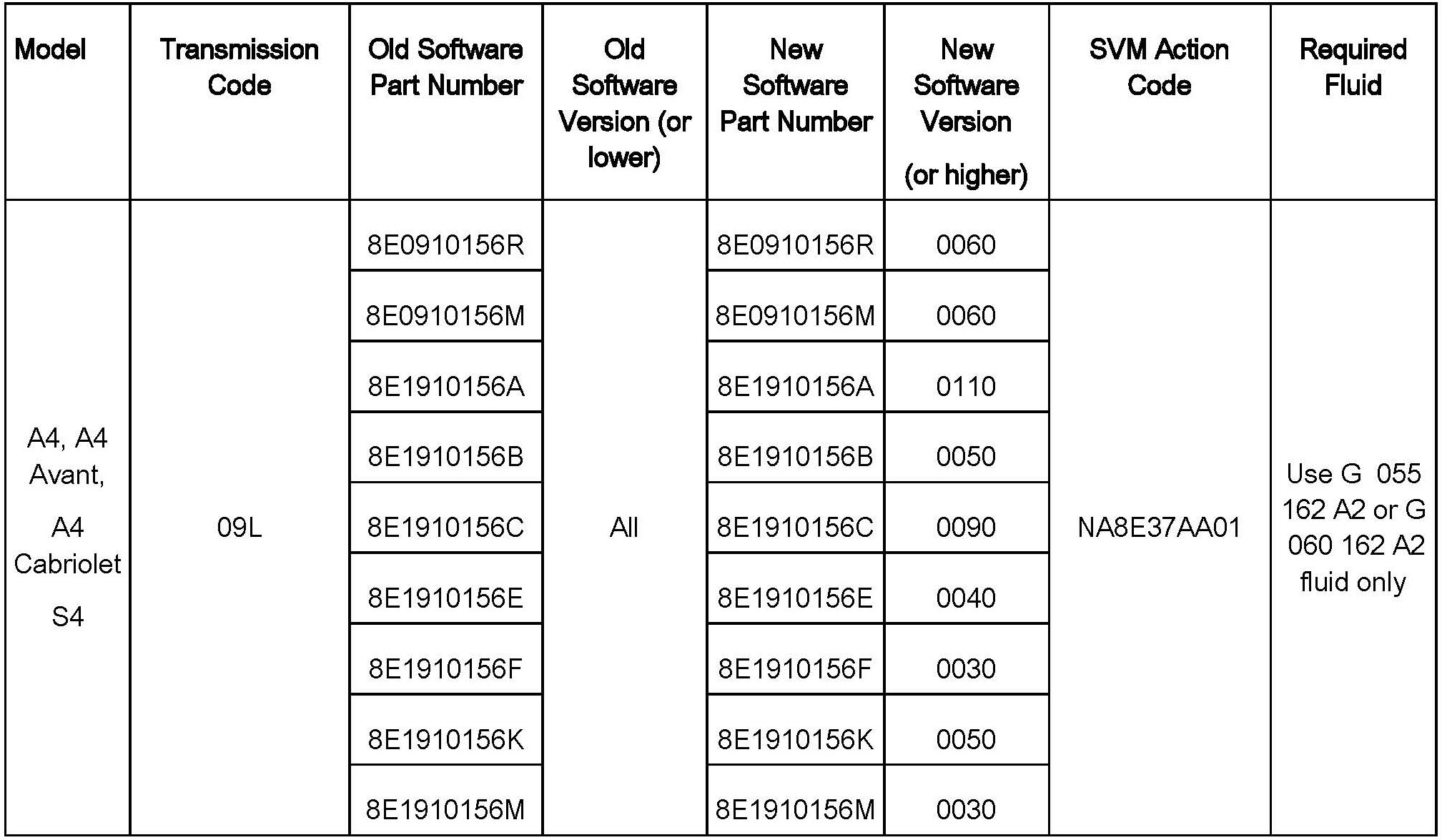 2. Update the Transmission Control Unit (J217) using the SVM action code as listed in the table shown if necessary.