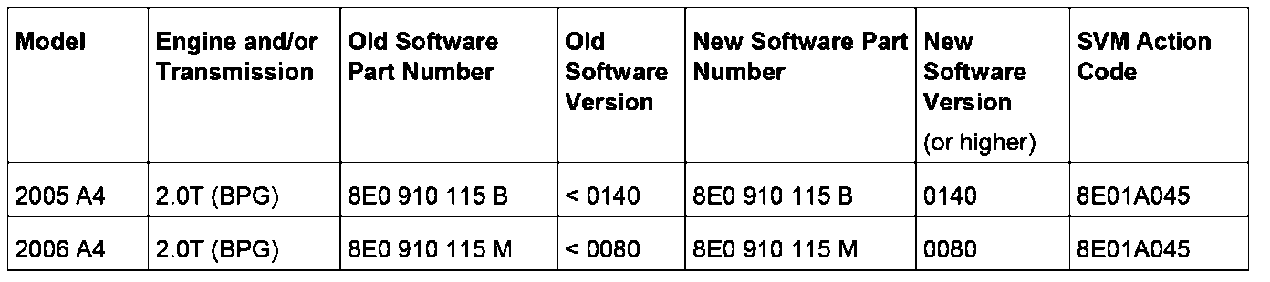 2. Update the Engine Control Module (J623) using the SVM action code as listed in the table if necessary.