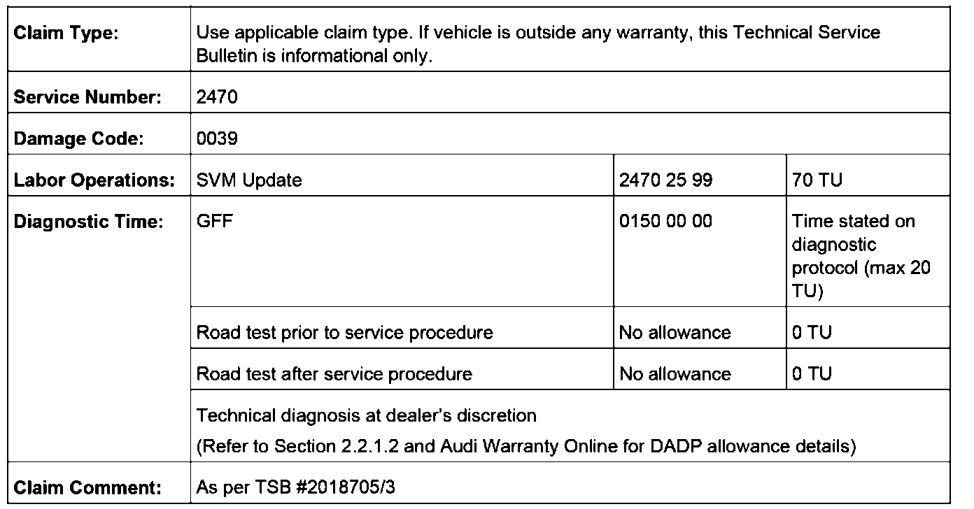 All warranty claims submitted for payment must be in accordance with the Audi Warranty Policies and Procedures Manual. Claims are subject to review or audit by Audi Warranty.