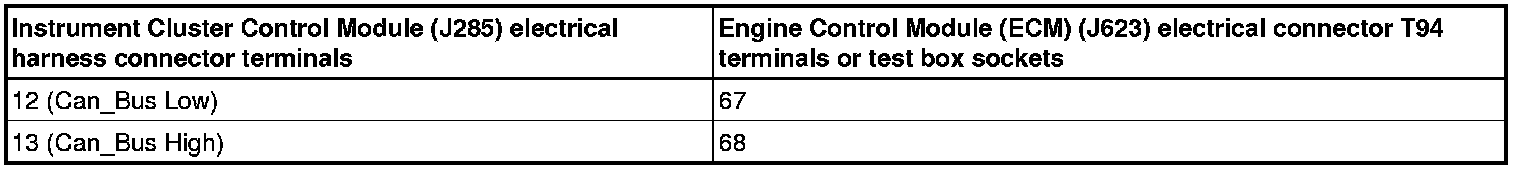 - Using a Multimeter, check the Instrument Cluster Control Module (J285) electrical harness connector to the Engine Control Module (ECM) (J623) electrical harness connector T94 for resistance.