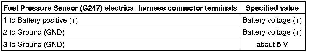 - Using a Multimeter, check the Fuel Pressure Sensor (G247) for voltage at the 14 pin electrical harness connector.