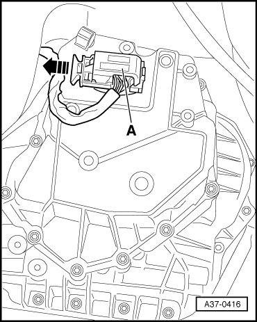 - Unlock connector - A - in direction of - arrow - and disconnect it from transmission.