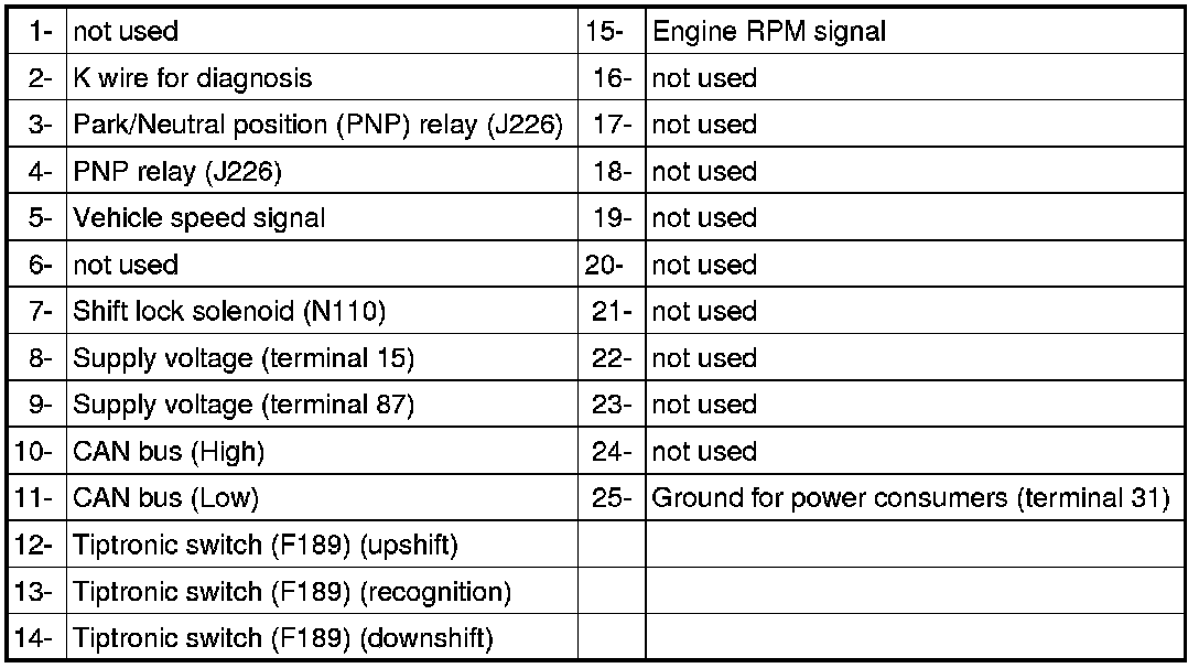 Multiple Harness Connector (25 Pin Connector) for Transmission Control Module (TCM) (J217 ) (Cavities on Adapter (VAG 1598/21))