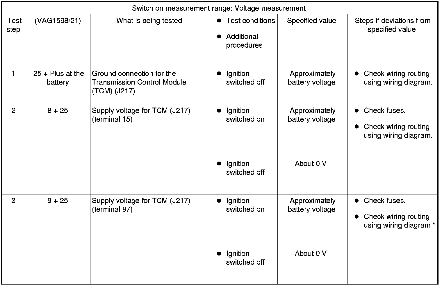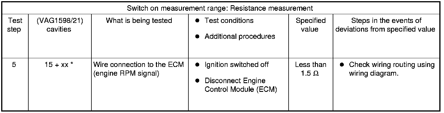• For testing, use multi meter (VAG1526A) or vehicle diagnostic testing and information system (VAS 5051 ). The charts contain the specific measurement methods which have to be set up before the corresponding measurements.