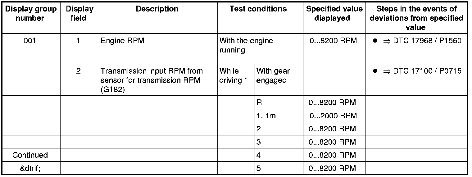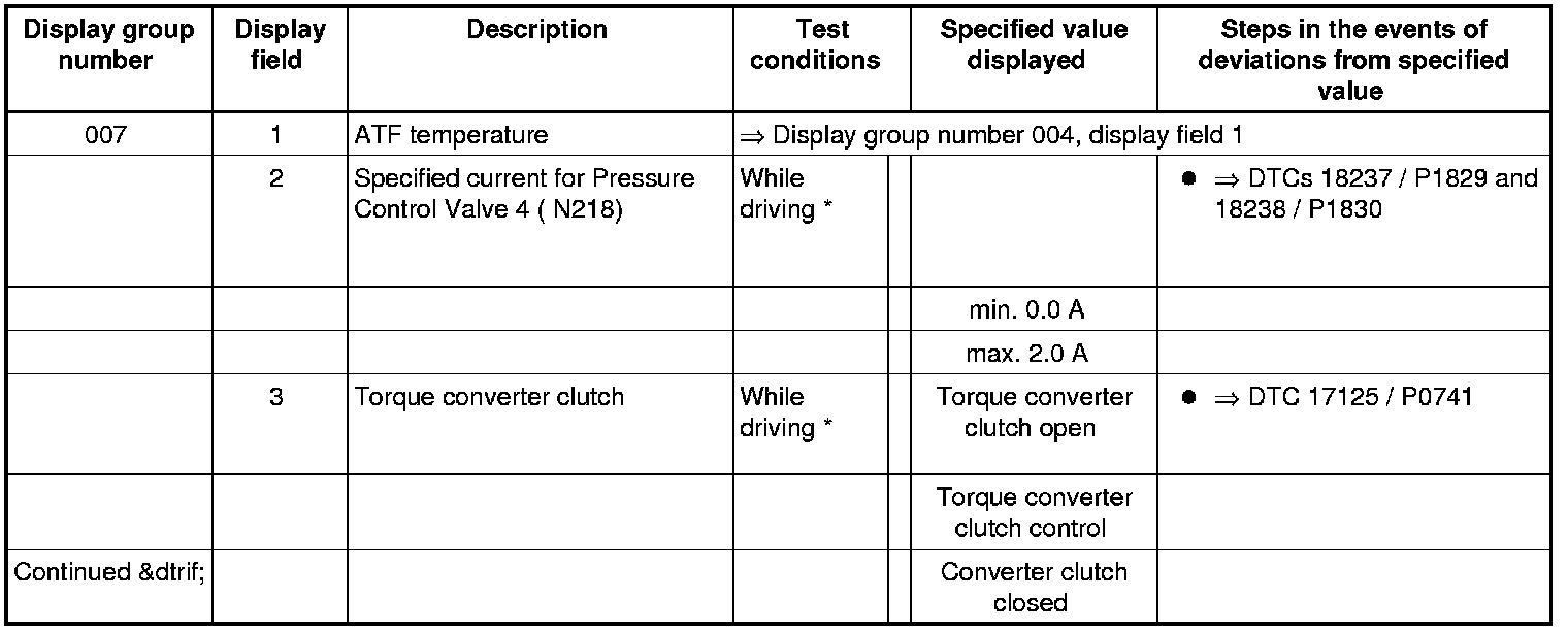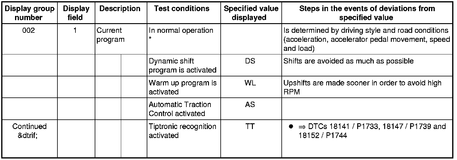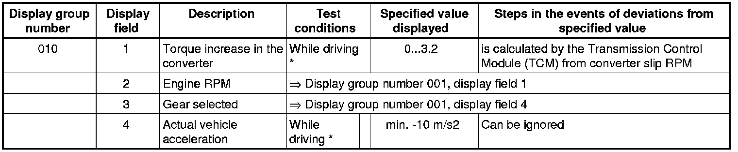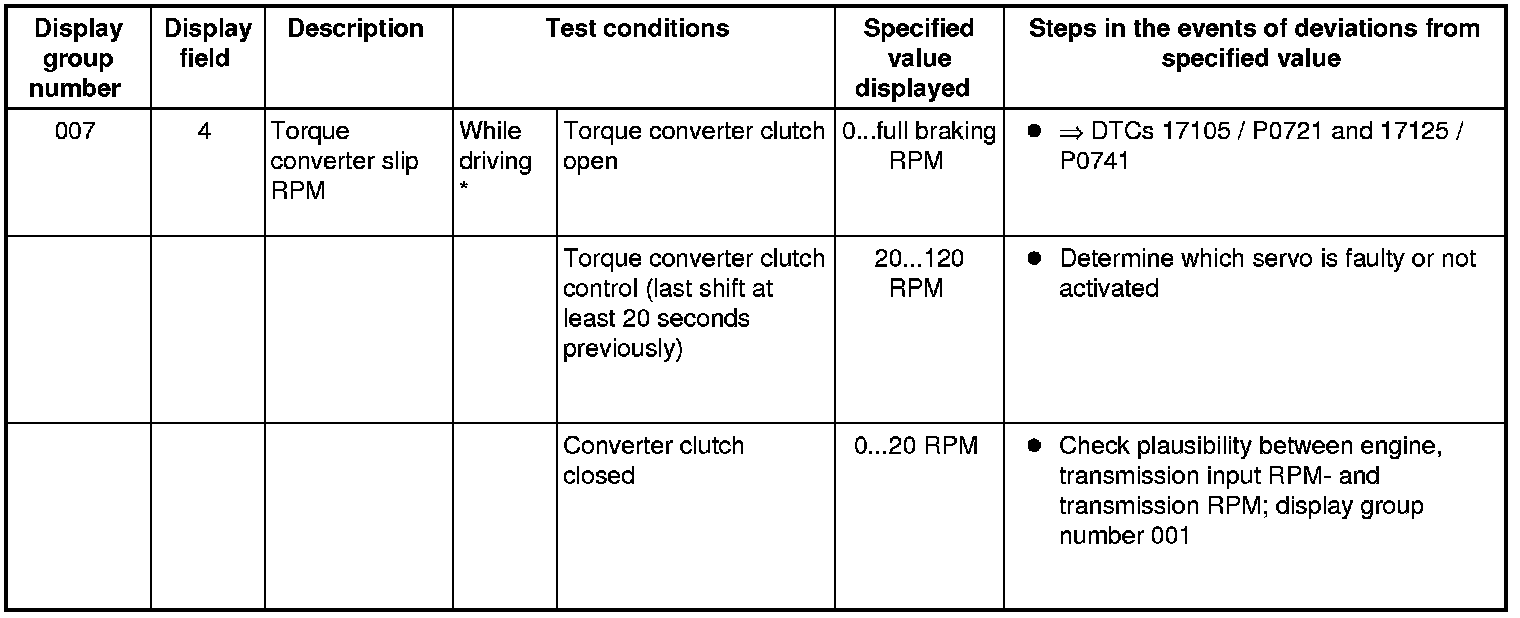 • "Converter clutch control": The values given apply to the "adjusted condition" of the converter clutch. Under unfavorable conditions (for example, accelerating on a hill) this condition will not be reached until 20 seconds after the completion of the shift. During this adjustment phase, slip values up to 350 RPM can be reached.