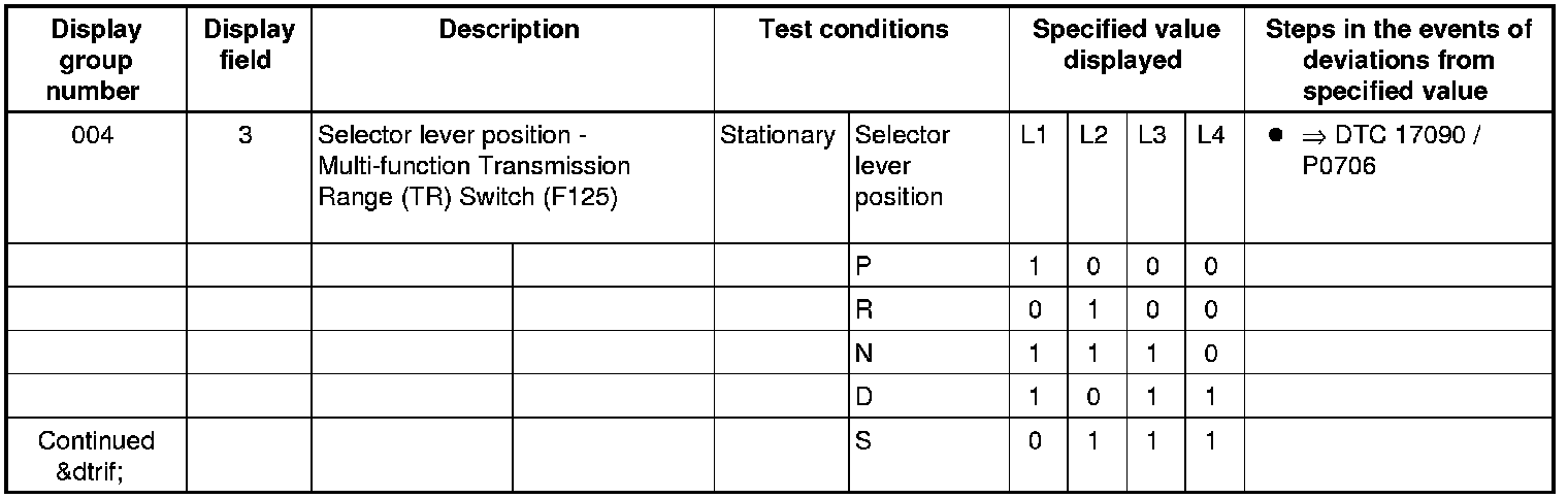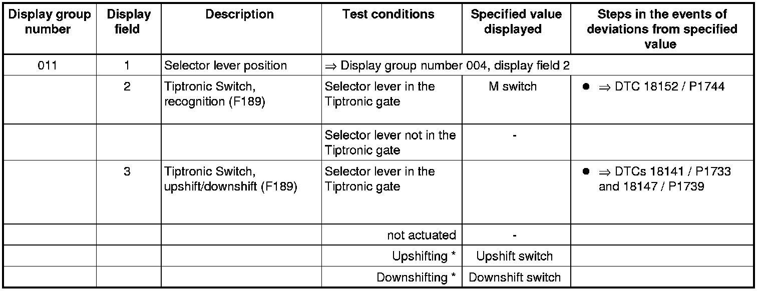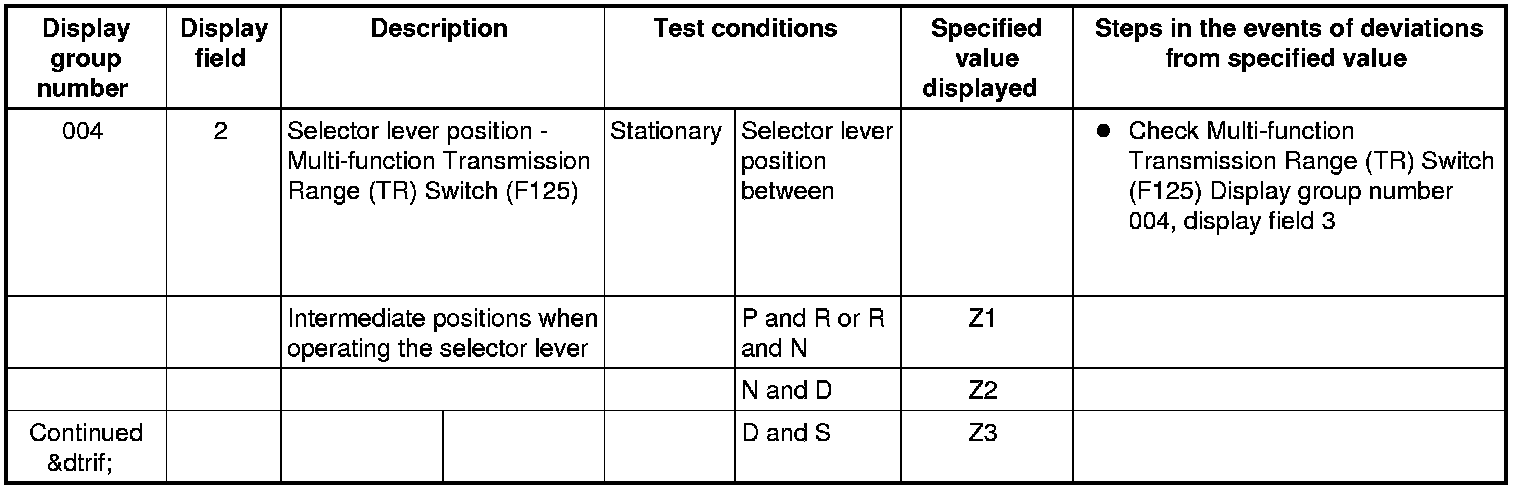 If the selector lever is shifted into one of the intermediate positions mentioned, "Z1", "Z2" or "Z3" is shown on the display. No selected gear must be shown in the display in the instrument cluster , that is to say, only PRNDS is displayed, without a gear being lit up.