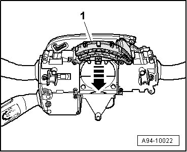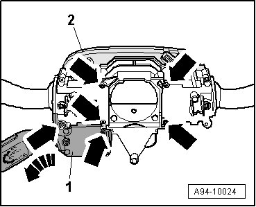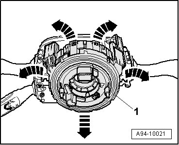 - Carefully release clip fasteners - arrows - and remove spiral spring - 1 - from steering column switch module.