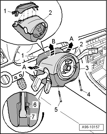 - Release trim cover - 1 - on upper steering column trim - 2 - using a small screwdriver - arrows A and B -.