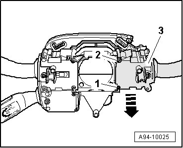 - Carefully release clip fasteners - arrows - and remove spiral spring - 1 - from steering column switch module.