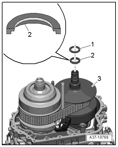 - Install old circlip - 1 - for disc set "I" into the groove on the old disc set "I" - 2 -.
