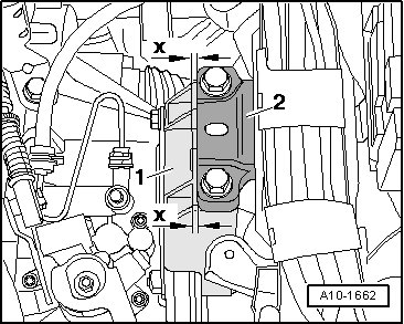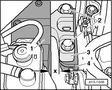 • A distance of - x - = 16 mm must be present between engine mount - 1 - and engine support - 4 -.