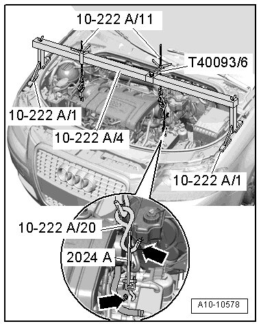 - Engage the spindle (10 - 222 A /11) at the lifting eye (2024 A /2) on the engine lifting eye.