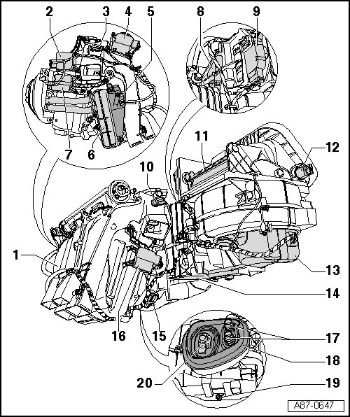 • Removing and installing, refer to => [ Auxiliary Air Heater Heating Element (Z35) with Control Module (J604) ] Auxiliary Air Heater Heating Element (Z35) With Control Module (J604).
