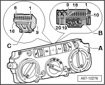 - Check voltage at connector - C - between terminals 9 and 10 e.g. using (V.A.G 1527 B) - B - (to Fresh/Recirculating Air Door Motor (V154) ).
