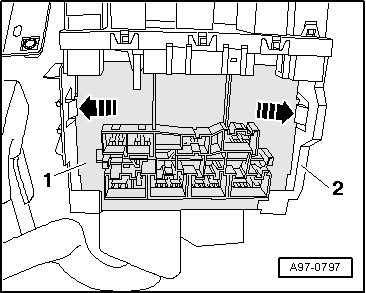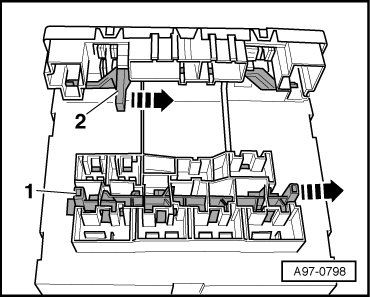 - Release retaining springs - arrows - and remove vehicle electrical system control module (J519) - item 1 - down from base mount - 2 -.