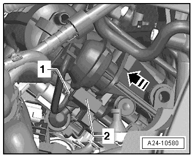 - Remove the adjusting element vacuum hose - 1 - for the IMRC valve from the control valve actuator - 2 -.