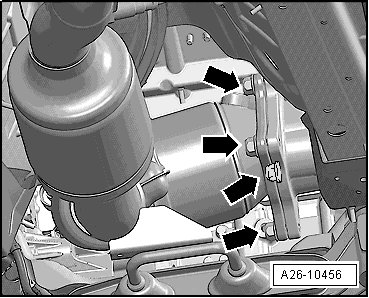 - Remove the remaining nuts - arrows - for the front exhaust pipe/turbocharger from below.