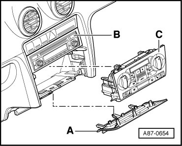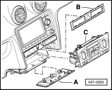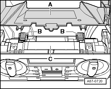 - Remove the trim - B - above the Climatronic control module) in the center of the instrument panel.