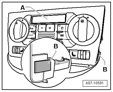 - Remove the trim - A - under the Climatronic control module (J255) in the instrument panel and the radio - B -).