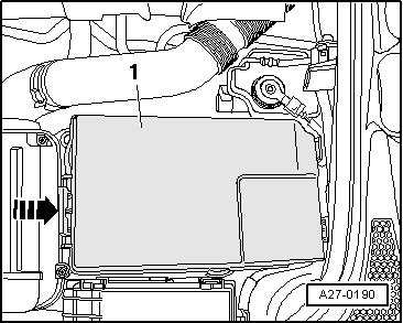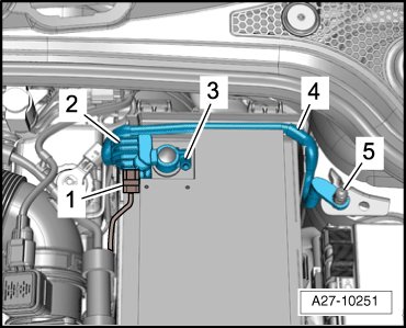 - Remove the nut - 5 - and ground cable - 4 - with the battery monitoring control module (J367) - item 2 -.