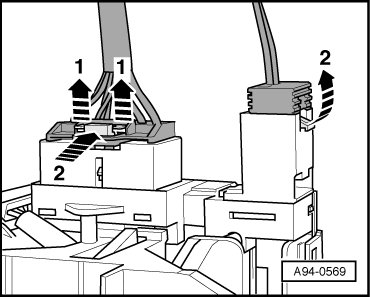 - Release retaining clips in - direction of arrow - and remove ignition key removal lock safety switch electrical connector - 2 -.