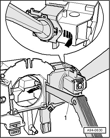 - Release retaining clips with 1.0 mm feeler gauge - item 1 - - arrows - and remove windshield wiper/washer switch (E22).