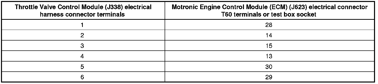 - Using a multimeter, check the Throttle Valve Control Module (J338) at electrical harness connector terminals to the Motronic Engine Control Module (ECM) (J623) electrical harness connector T60 terminals for an open circuit according to the wiring diagram.