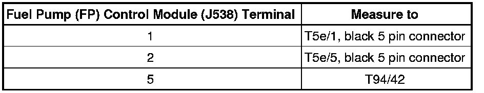 - Using a multimeter, check the Fuel Pump (FP) Control Module (J538) wiring harness terminal 1 to T5a/1, black 5 pin connector, for resistance.