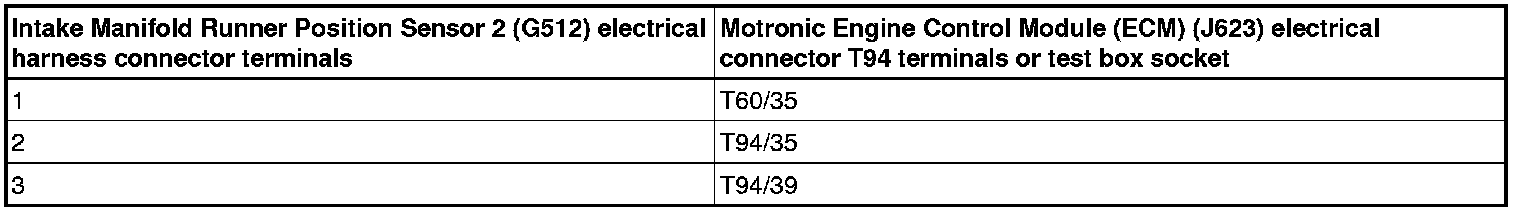 - Using a multimeter, check the Intake Manifold Runner Position Sensor 2 (G512) electrical harness connector terminals to the Motronic Engine Control Module (ECM) (J623) electrical harness connector T94 terminals for an open circuit.