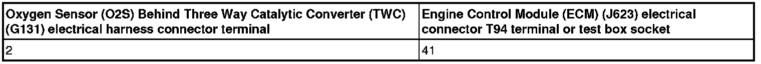 - Using a multimeter, check the Oxygen Sensor (O2S) Behind Three Way Catalytic Converter (TWC) (G131) electrical harness connector to the Engine Control Module (ECM) (J623) electrical harness connector T94 for resistance.