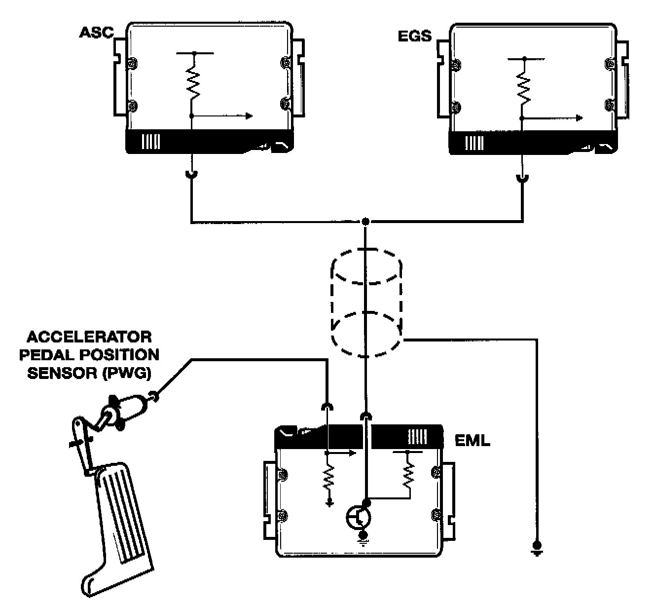 The position of the accelerator pedal is supplied to the ASC control nit by the Electronic Throttle Regulation (EML). It exists as a pulsed signal at a constant frequency, with a varying duty cycle.