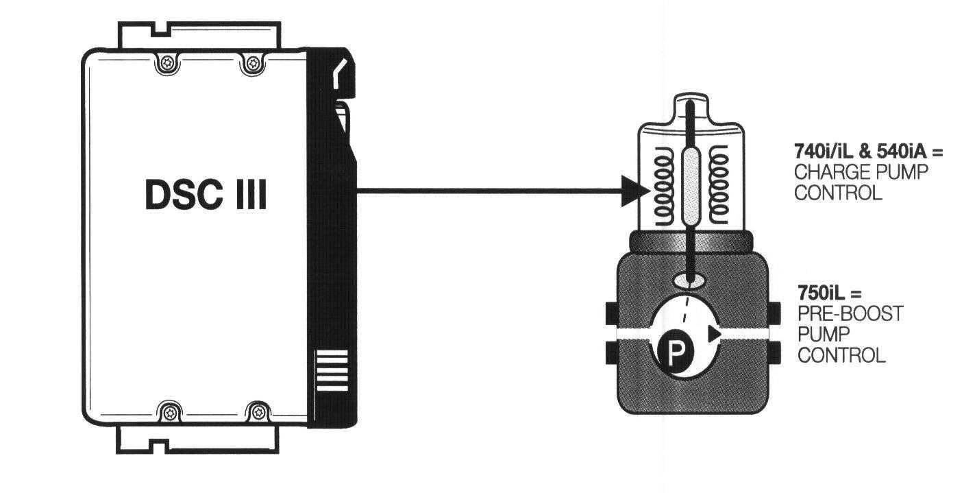 Control of the charge or pre-boost pump is an output function of the DSC control module. During Dynamic Stability Control (DSC) regulation that requires dynamic stability control, the module activates the pump to ensure that a sufficient supply of brake fluid is available for the hydraulic circuit's function.