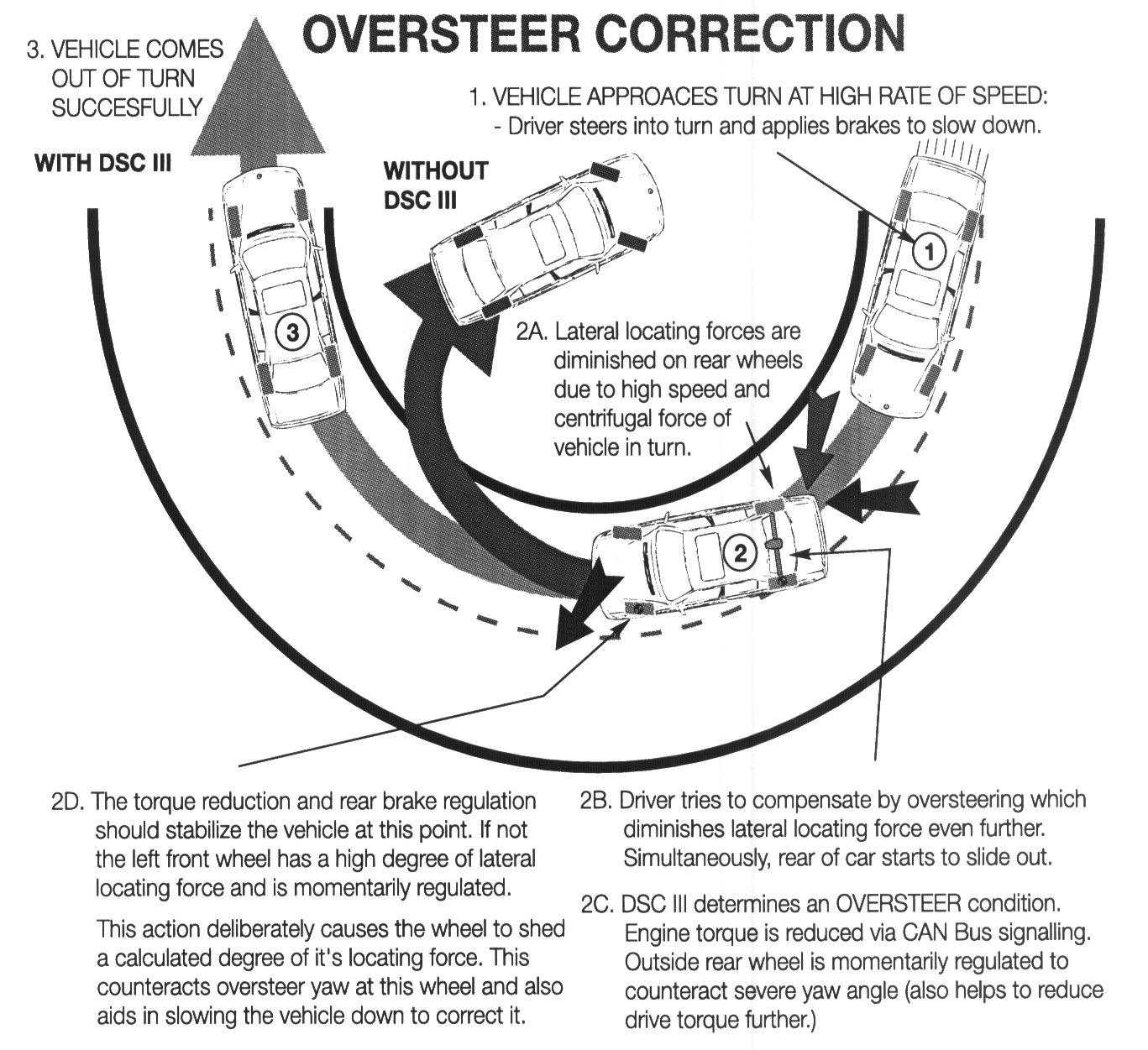 All of the familiar braking and straight line traction control features and system communication carry over from DSC II. Based on select high/select low logic, the Dynamic Stability Control (DSC) III control module selects a vehicle stabilizing strategy based on the specific input signal values it is monitoring at the moment. For all DSC strategies this begins with engine intervention to reduce torque: