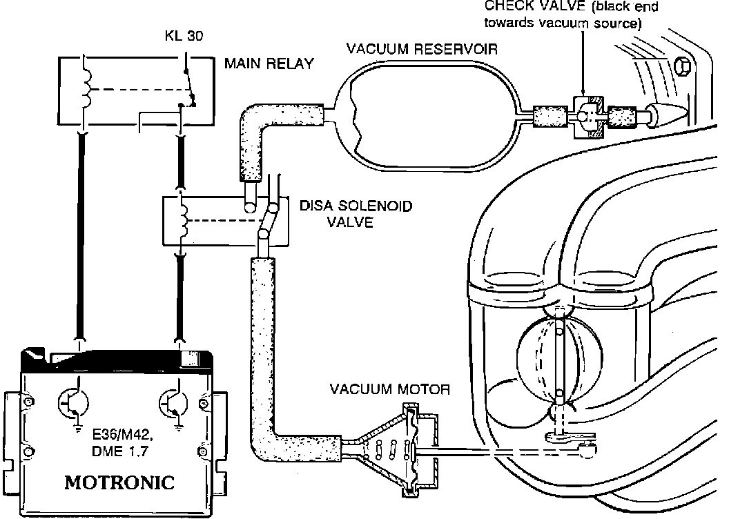During low- and mid-range engine operation (<4,800 rpm), the DME control unit powers the solenoid valve open which applies reservoir vacuum to the vacuum motor. When activated, the vacuum motor causes the changeover valve to close creating a "long pipe" condition. As the engine approaches the high rpm range (>4,800 rpm), the long pipe advantage diminishes. When the changeover valve opens (>4,800 rpm), the engine breathing dynamics change due to the short RAM air pipes, creating higher output. The changeover valve closes below 4,760 rpm and opens above 4,800 rpm. The overlap of 80 rpm prevents the repeated open and closing of the valve.