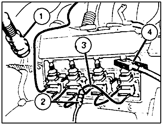 Connect trigger clip (4) of the BMW Service Tester to power supply lead of the ignition coil for cylinder no. 1.