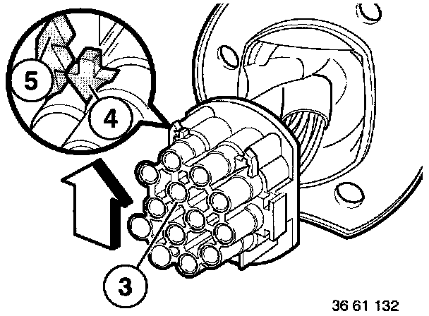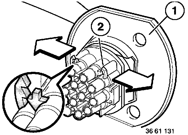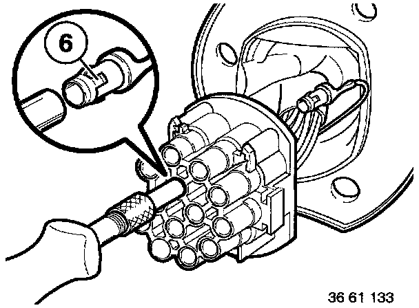 - Using special tool 61 1 132 (ejector), press down retaining hooks (6) on appropriate contact and pull out cable.