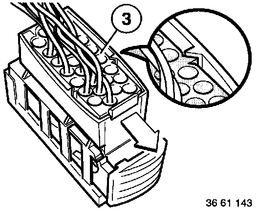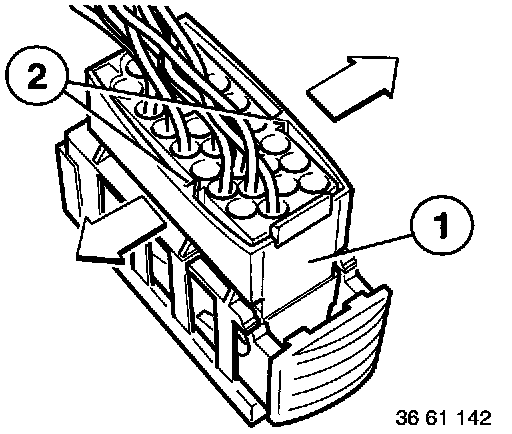 - With special tool 61 1 132 (ejector), press back arrester hook (4) of appropriate contact and pull out cable.
