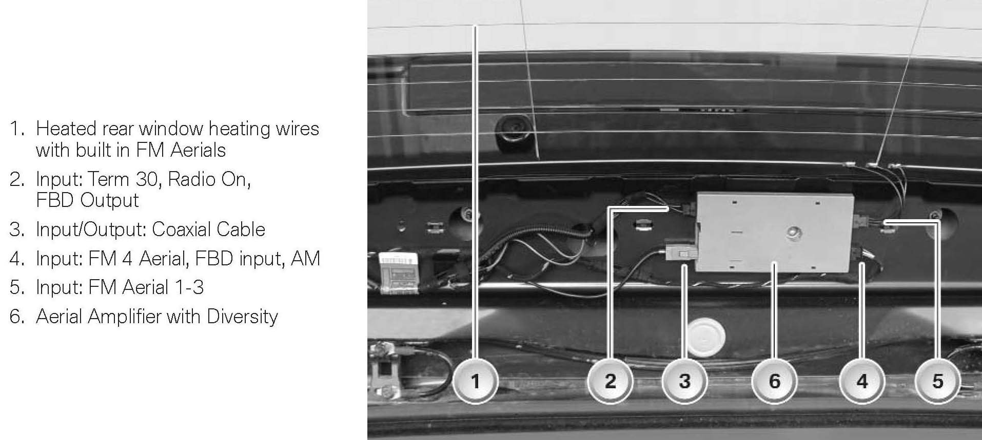 The tuner is connected to the aerial diversity module via an aerial connector (Fakra) and a coaxial cable. The antenna diversity switches to the next aerial as soon as the signal quality of the active FM aerial exceeds a defined threshold value. No interruption can be heard when the diversity module switches over. Evaluation of the signal quality and the switch over only occur in the aerial diversity module.