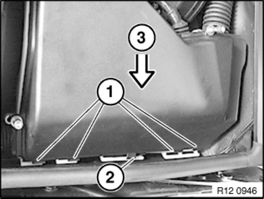 Hook cover (3) into hinges of underside of electronics box (1). Make sure upper stop (2) is correctly installed above hinges on underside of electronics box.