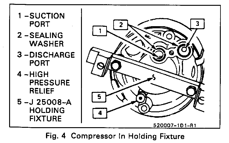 The Pressure Relief Valve, located in the compressor rear head casting (Fig. 4). should only be replaced after recovering refrigerant. A new valve and O-ring coated with 525 viscosity refrigerant oil should be installed.