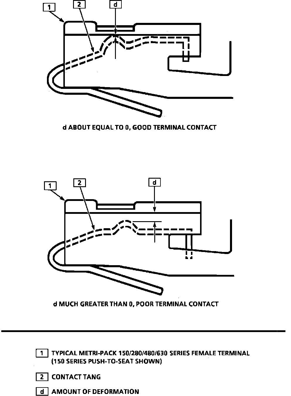 When diagnosing an electrical system that utilizes Metri-Pack 150/280/480/630 series terminals (refer to GM Terminal Repair Kit, J 38125-A, instruction manual, J 38125-4 for terminal identification), it is important to check terminal contact between a connector and component, or between in-line connectors, before replacing a suspect component.