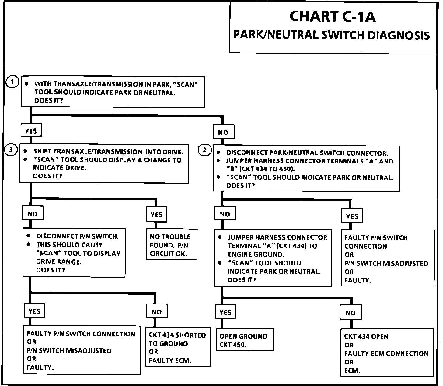 1. Checks for a closed switch to ground in the park position. Different makes of "Scan" tools will read Park/Neutral differently. Refer to operators manual for type of display used for a specific tool.